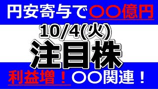 円安寄与で〇〇億円利益増!あの株【10月4日(火)の注目銘柄まとめ】本日の株式相場振り返りと明日の注目銘柄・注目株・好材料・サプライズ決算を解説、株式投資の参考に