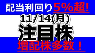 配当利回り5%超!増配株多数!【11月14日(月)の注目銘柄まとめ】本日の株式相場振り返りと明日の注目銘柄・注目株・好材料・サプライズ決算を解説、株式投資の参考に