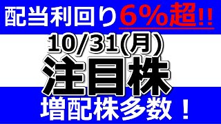 驚異の配当利回り6%超!注目の増配株多数!【10月31日(月)の注目銘柄まとめ】本日の株式相場振り返りと明日の注目銘柄・注目株・好材料・サプライズ決算を解説、株式投資の参考に
