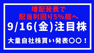 増配発表で配当利回り5%超へ!大量自社株買いの〇〇!【9月16日(金)の注目銘柄まとめ】本日の株式相場振り返りと明日の注目銘柄・注目株・好材料・サプライズ決算を解説、株式投資の参考に