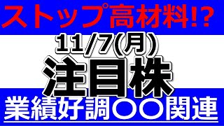 ストップ高級の材料!?業績好調〇〇関連【11月7日(月)の注目銘柄まとめ】本日の株式相場振り返りと明日の注目銘柄・注目株・好材料・サプライズ決算を解説、株式投資の参考に