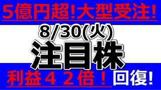 5億円超の大型受注!利益42倍!業績回復!【8月30日(火)の注目銘柄まとめ】本日の株式相場振り返りと明日の注目銘柄・注目株・好材料・サプライズ決算を解説、株式投資の参考に
