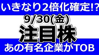 いきなり株価2倍化確定!?あの有名企業がTOBを発表!【9月30日(金)の注目銘柄まとめ】本日の株式相場振り返りと明日の注目銘柄・注目株・好材料・サプライズ決算を解説、株式投資の参考に