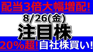 配当3倍大幅増配!20%超の自社株買いも!【8月26日(金)の注目銘柄まとめ】本日の株式相場振り返りと明日の注目銘柄・注目株・好材料・サプライズ決算を解説、株式投資の参考に