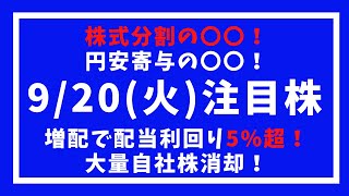 〇〇が株式分割発表!増配で配当利回り5%超!大量自社株消却!【9月20日(火)の注目銘柄まとめ】本日の株式相場振り返りと明日の注目銘柄・注目株・好材料・サプライズ決算を解説、株式投資の参考に