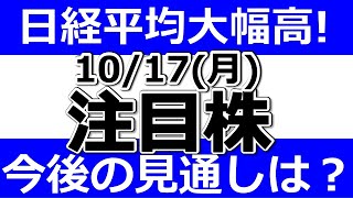 日経平均大幅高!でも見通しは怪しい?【10月17日(月)の注目銘柄まとめ】本日の株式相場振り返りと明日の注目銘柄・注目株・好材料・サプライズ決算を解説、株式投資の参考に