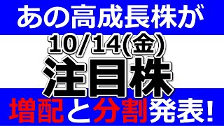 あの高成長株が増配と株式分割発表!【10月14日(金)の注目銘柄まとめ】本日の株式相場振り返りと明日の注目銘柄・注目株・好材料・サプライズ決算を解説、株式投資の参考に