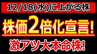 株価2倍化宣言した激アツ大本命株!【12/18(水)に株価が上がる株・明日上がる株・株式投資日本株最新情報】