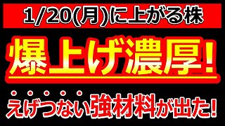 爆上げ濃厚!えげつない強材料が出た20年減配無しの超優良株!【1/20(月)に株価が上がる株・明日上がる株・株式投資日本株最新情報】