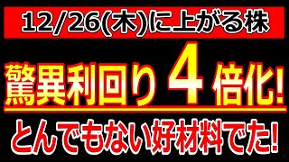 驚異利回り4倍化!とんでもない好材料でた!【12/26(木)に株価が上がる株・明日上がる株・株式投資日本株最新情報】