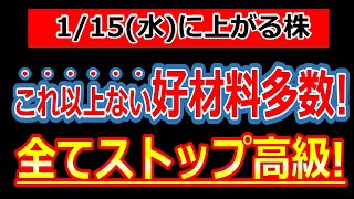 これ以上ない好材料多数!全てストップ高級!【1/15(水)に株価が上がる株・明日上がる株・株式投資日本株最新情報】