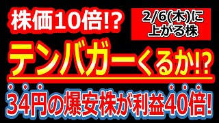 【株価10倍(テンバガー)候補!?たった34円の爆安株が利益40倍で大相場突入!】2/6(木)に株価が上がる株・明日上がる株・株式投資日本株最新情報