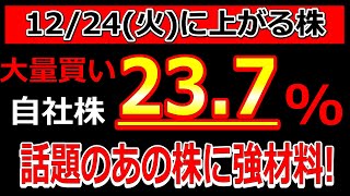 最近話題のあの株がとんでもない大量自社株買い23.7%を発表!【12/24(火)に株価が上がる株・明日上がる株・株式投資日本株最新情報】