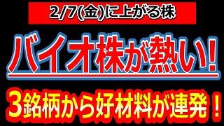 【バイオ株祭り開幕!?バイオ株が熱い!3銘柄から好材料が連発!】2/7(金)に株価が上がる株・明日上がる株・株式投資日本株最新情報
