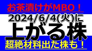 2024/6/4(火)に株価が上がる株、株式投資・デイトレの参考に。お茶漬けがMBO!超絶材料出た大注目株も!?