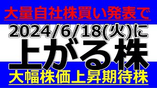 2024/6/17(火)に株価が上がる株、株式投資・デイトレの参考に。大量自社株買い発表で大幅株価上昇期待株!
