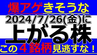 2024/7/26(金)に株価が上がる株、株式投資・デイトレの参考に。爆アゲきそうな、この4銘柄見逃すな!