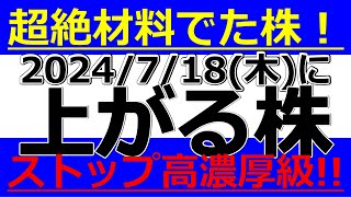 2024/7/18(木)に株価が上がる株、株式投資・デイトレの参考に。超絶材料でた株!ストップ高濃厚級!!