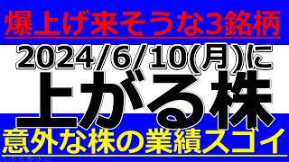 2024/6/10(月)に株価が上がる株、株式投資・デイトレの参考に。爆上げ来そうな3銘柄!意外な株の業績スゴイ!
