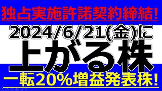 2024/6/21(金)に株価が上がる株、株式投資・デイトレの参考に。独占実施許諾契約締結!一転20%増益発表株!