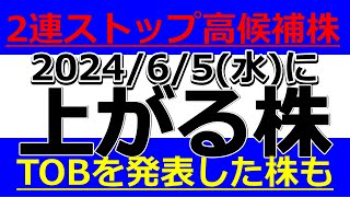 2024/6/5(水)に株価が上がる株、株式投資・デイトレの参考に。2連ストップ高候補株!TOBを発表した株も!