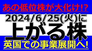 2024/6/25(火)に株価が上がる株、株式投資・デイトレの参考に。あの低位株が大化けくる!?英国での事業展開へ!