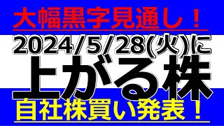 2024/5/28(火)に株価が上がる株、株式投資・デイトレの参考に。大幅黒字見通し!自社株買い発表!