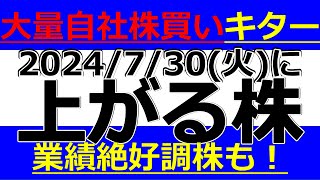 2024/7/30(火)に株価が上がる株、株式投資・デイトレの参考に。大量自社株買いで爆上げ濃厚か!?