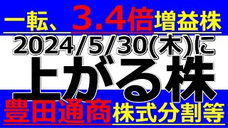 2024/5/30(木)に株価が上がる株、株式投資・デイトレの参考に。一転、3.4倍増益な株!豊田通商株式分割など