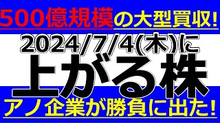 2024/7/4(木)に株価が上がる株、株式投資・デイトレの参考に。500億規模の大型買収!アノ企業が勝負に出た!