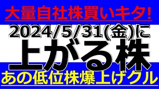 2024/5/31(金)に株価が上がる株、株式投資・デイトレの参考に。大量自社株買いキタ!あの低位株爆上げクル!?