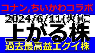 2024/6/11(火)に株価が上がる株、株式投資・デイトレの参考に。コナン,ちいかわコラボで過去最高益エグイ株!