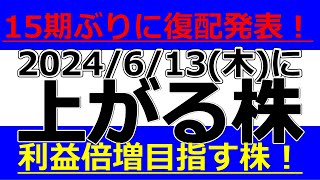 2024/6/13(木)に株価が上がる株、株式投資・デイトレの参考に。15期ぶりに復配発表!利益倍増目指す株!