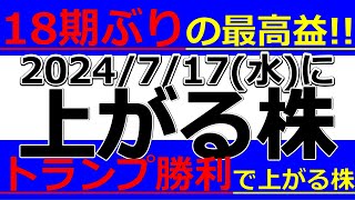 2024/7/17(水)に株価が上がる株、株式投資・デイトレの参考に。18期ぶりの最高益!!トランプ勝利で上がる株!