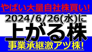 2024/6/26(水)に株価が上がる株、株式投資・デイトレの参考に。やばい大量自社株買い!事業承継激アツ株!