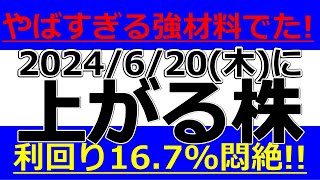 2024/6/20(木)に株価が上がる株、株式投資・デイトレの参考に。やばすぎる強材料でた!利回り16.7%悶絶!!