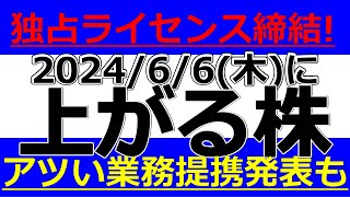 2024/6/6(木)に株価が上がる株、株式投資・デイトレの参考に。独占ライセンス締結!アツい業務提携発表も!