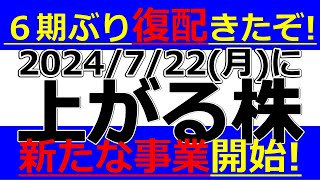 2024/7/22(月)に株価が上がる株、株式投資・デイトレの参考に。6期ぶり復配きたぞ!新たな事業を開始する株!