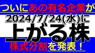 2024/7/24(水)に株価が上がる株、株式投資・デイトレの参考に。ついにあの有名企業が株式分割を発表しました!