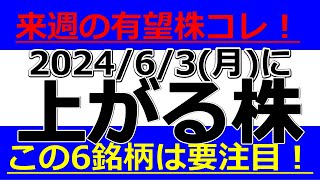 2024/6/3(月)に株価が上がる株、株式投資・デイトレの参考に。来週の有望株コレ!この6銘柄は要注目!