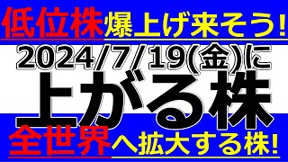 2024/7/19(金)に株価が上がる株、株式投資・デイトレの参考に。低位株爆上げ来そう!全世界へ拡大する株!