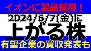 2024/6/7(金)に株価が上がる株、株式投資・デイトレの参考に。イオンに製品採用!有望企業の買収発表も!