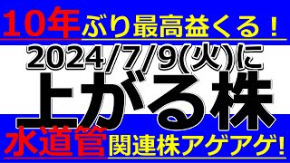 2024/7/9(火)に株価が上がる株、株式投資・デイトレの参考に。10年ぶり最高益くる!水道管関連株アゲアゲ!