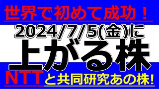 2024/7/5(金)に株価が上がる株、株式投資・デイトレの参考に。世界で初めて成功!NTTと共同研究あの株!
