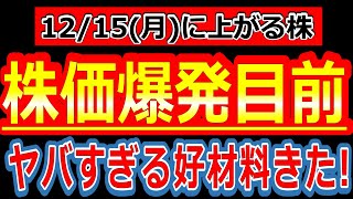 【ヤバすぎる好材料きた!株価爆発目前のあの株!】12/15(月)に株価が上がる株・株式投資日本株最新情報