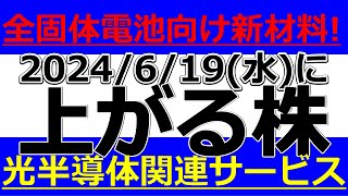 2024/6/19(水)に株価が上がる株、株式投資・デイトレの参考に。全固体電池向け新材料!光