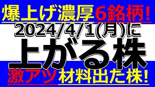 2024/4/1(月) 爆上げ濃厚6銘柄!激アツ材料出た株!株式投資・デイトレの参考に。3月、4月の株式分割まとめ、決算スケジュールほか