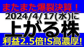 2024/4/17(水)に株価が上がる株、株式投資・デイトレの参考に。またまた爆裂決算!利益2.5倍でストップ高濃厚!