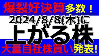 2024/8/8(木)に株価が上がる株、株式投資・デイトレの参考に。爆裂好決算多数!大増配で配当利回り6%超株や大量自社株買い発表した株!