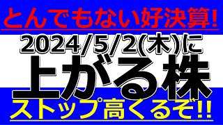 2024/5/2(木)に株価が上がる株、株式投資・デイトレの参考に。とんでもない好決算!ストップ高くるぞ!!